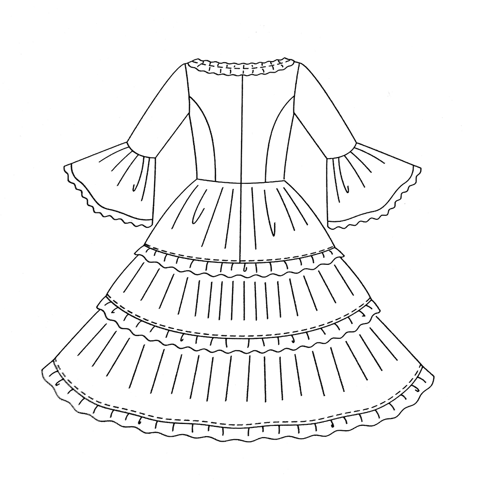 This Set Includes: #32 Half Bonnet #34 Bib Front One Piece with Flared Sleeves and Tiered Skirt