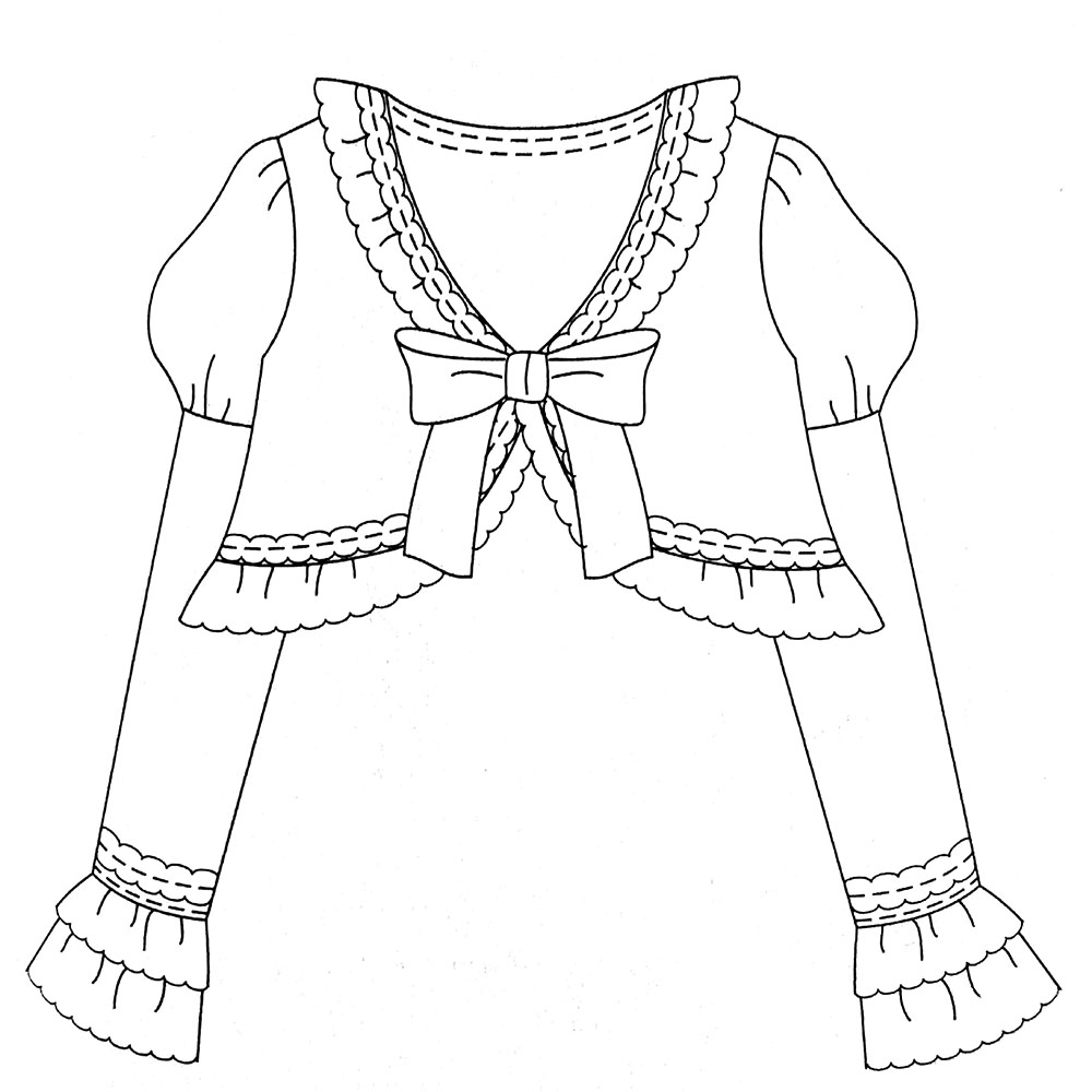 This Collection Includes: #01 Long Sleeve Bolero #02 Long Sleeve Blouse #03 Jumperskirt with Shirring and Lace-Up Front #04 Hooded Cape #05 Skirt with Elastic Waistband #06 Drawers #07 Classic Headdress #08 Headband with Bow